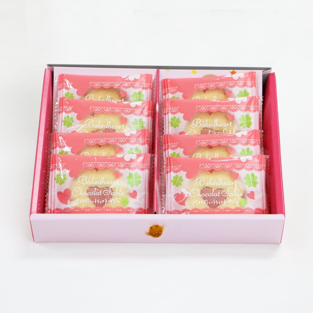 ハート型イチゴ味のチョコが入っているサクサクのサブレ8枚入り